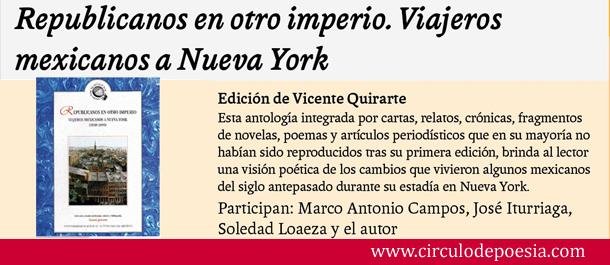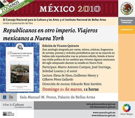 Este domingo 21 de marzo a las 12 horas en la Sala Manuel M. Ponce del Palacio de Bellas Artes se lleverá a cabo la presentación del libro Republicanos en otro imperio. Viajeros mexicanos a Nueva York. Los comentarios correrán a cargo de Marco Antonio Campos, José Iturriaga, Soledad Loaeza y el autor, Vicente Quirarte. Lectura: Elena de Haro, Guillermo Henry y Gilberto Pérez Gallardo. Dirección de escena: Eduardo Ruiz Saviñón. La entrada es libre.